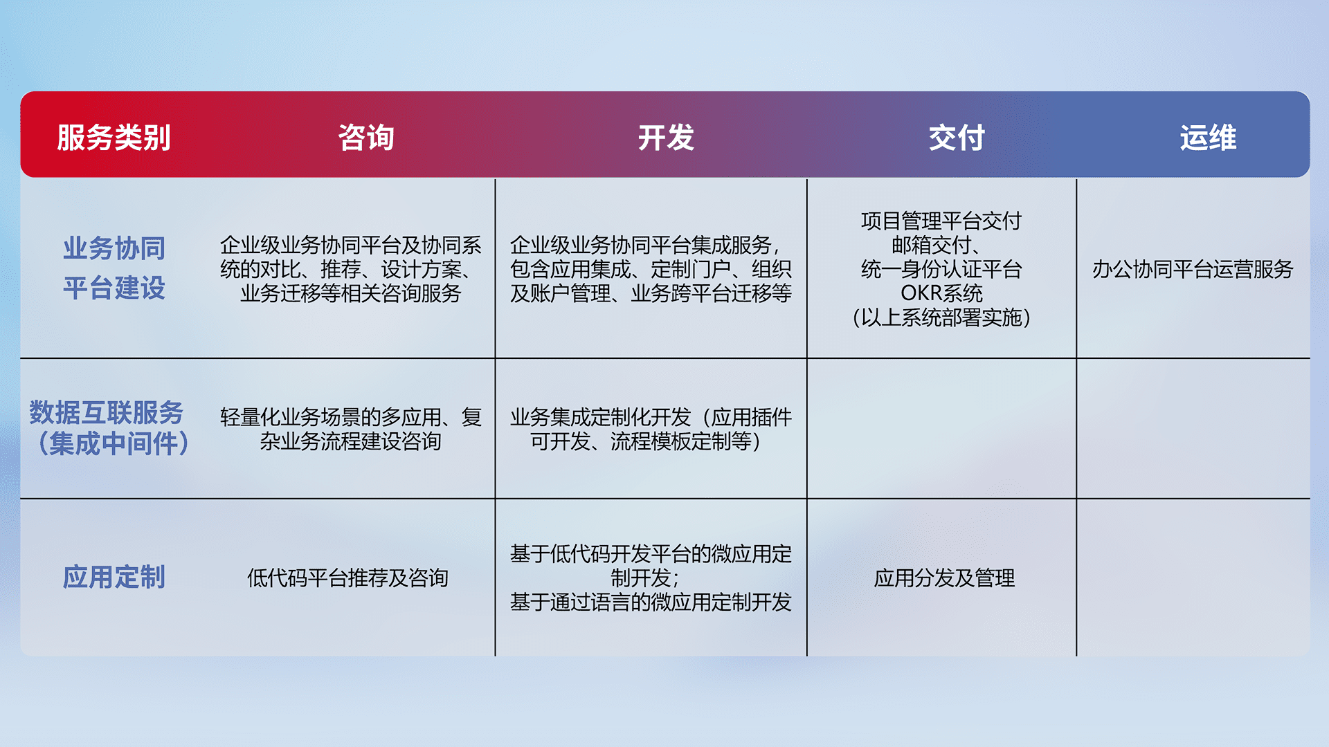 针对钉钉、、、、企微、、、IDaas等平台级产品提供产品的规划、、、、方案、、、、交付、、、、定制化开发等服务,,实现如统一协同办公、、智能客户服务、、、、混合会议管理、、、智能数据查询、、、等业务场景,,,,实现数字化转型。。